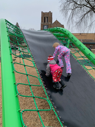 Bright snow shoveled, neighbors saying hello, back out into the day to a favorite place. Chips and drinks and lunches and laughter, strange offers of salt and pepper from a helpful place as a child imitates the world. A quick hug with a friend, then crayons and colors and dressmaking diversions, a promise to return soon. Hungry anger, strawberry smoothie and soothed feelings, twilight shopping for screens. A ride of toy trucks, hands waving, kisses blown, shiny eyes and teeth gleaming with cheer; her first time with just sister. Screaming on a rollercoaster to the ceiling, streaking through the dark sparkled mall, flying around corners with our very first thrill-seeker by my side, the laughing exclamatory high as we disembark. One last circle riding horses, then back to snacks and pajamas and light-up glasses, a toast of water by the fire with kisses all around. Some silly shows, then snuggled deep, exhausted but comforted by a day together.